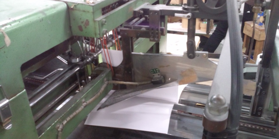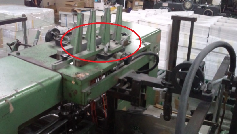 製本の現場で活躍する「トライオート」は、「➀カバー、②帯、③スリップ、④挟み込み印刷物」の本への装着を、一つの工程で行うことができる機械です。