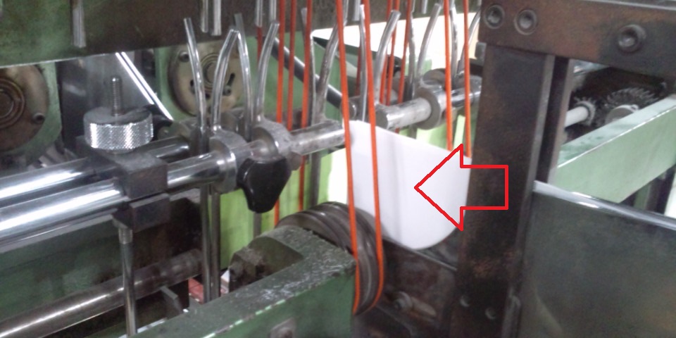 挿入部にセットしたスリップが一枚ずつ送られていき、コンベアで流れてきた本に挟み込まれていく仕組みです。